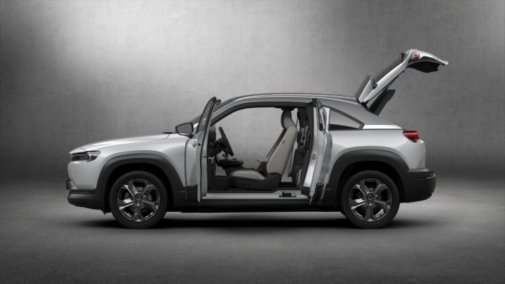 Mazda MX-30 er 5-dørs, – eller skal vi sige 3-dørs plus to gange en halv. Dørene til bagsædet er ikke almindelige, men heller ikke ukendte. Det er den type bagdør man bl.a. finder i mellemstore pick-up modeller, en type selvmordsdør men uden midterstolpe i bilen (B-stolpe) og det betyder, at man kun behøver at åbne en dør, for at kunne klare det hele overalt i bilen.