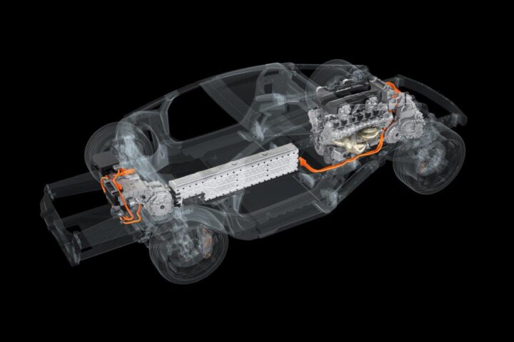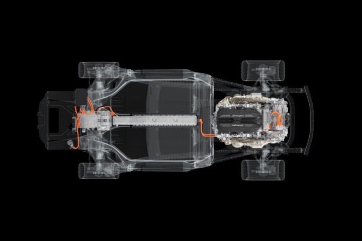 Lambo-hybrid. Hybrid med tre elmotorer, og en ændret konstruktion i den klassiske opskrift fra Lamborghini, for man har vendt op og ned på gearkassen, så den nye ligger bagerst i bilen, på samme måde som det også kendes fra formel 1 bilen, mens pladsen i den tidligere kardantunnel under bilen nu bliver brugt til et batteri, som Lamborghini mener er noget ganske særligt, selv om det sikkert er købt i Kina som de fleste andre, men det særlige skulle være, at batteripakken kun er 15,5 cm lang,mens batteriet har en kapacitet på 3,8 kWh.