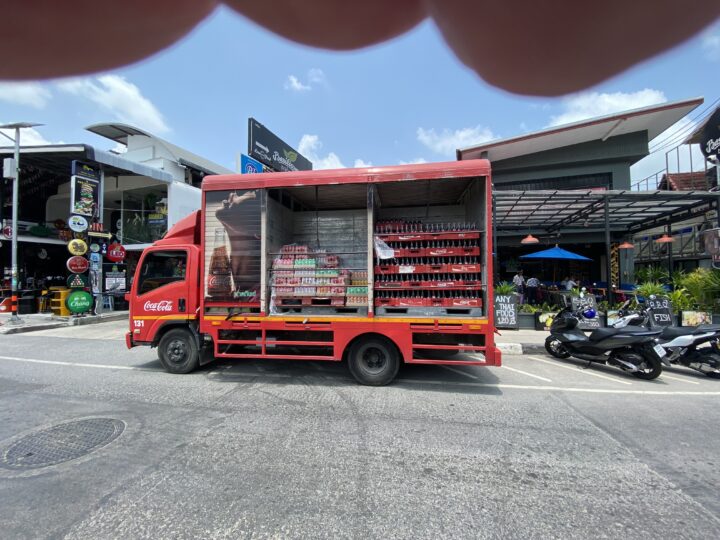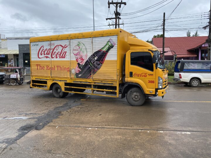 I Thailand kører bilerne fra Coca-Cola stadig. Jo længere man kommer ud på øerne, og jo mindre byerne for færgefart bliver, skifter farven på lastbilerne, de røde er de nyeste, mens de gule er den klassiske type lastbil, og jaloiusilågerne der kan rulles ned over de fyldte rækker med drikkevarer, findes i bedste velgående.