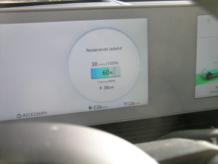Ladetempo som vi oftest oplever det, og det er ikke Hyundai der er problemet. Det er leverandøren. Der er 60 procent på batteriet, og vi lader med 38 kWh.