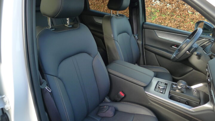 Testbilen er både den første af de tre, og den model Mazda selv regner med skal være den absolutte frontfigur. En på alle måde meget almindelig konstruktion, hvis vi ser på de større SUV-modeller, og der hvor CX-60 skiller sig ud, – eller henter ekstra point, er på batteripakken, det man må sætte på krogen, og vel også på det indtryk man får af lækkerier, når man sætter sig ind i kabinen.