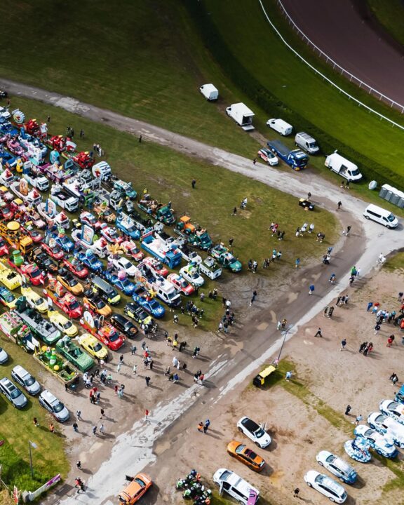 Følgebiler parkeret umiddelbart efter en etape. Der er tætpakket på parkeringsområdet.