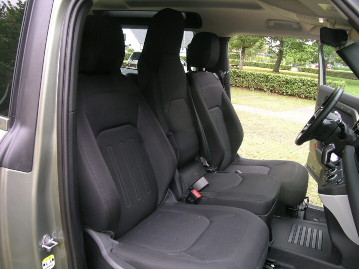Land Rover ønskede også at vise, at man kan gøre bilen til en 6-personers. Det gør man ved at indsætte et ekstra sæde på forreste række, og helt ærligt. Man skal virkelig have et behov, før man gør noget så drastisk ved bilen. Det højtplacerede midtersæde koster både en velfungerende midterkonsol, men det er konstant og hele tiden i vejen. Så meget, at man føler sig lidt klemt i førersædet, så nok engang, spar de 6000 kr der koster, at smække et midtersæde ind på forreste række i en kort Defender. Det er og bliver en nødløsning. Især når der er passager i sædet.