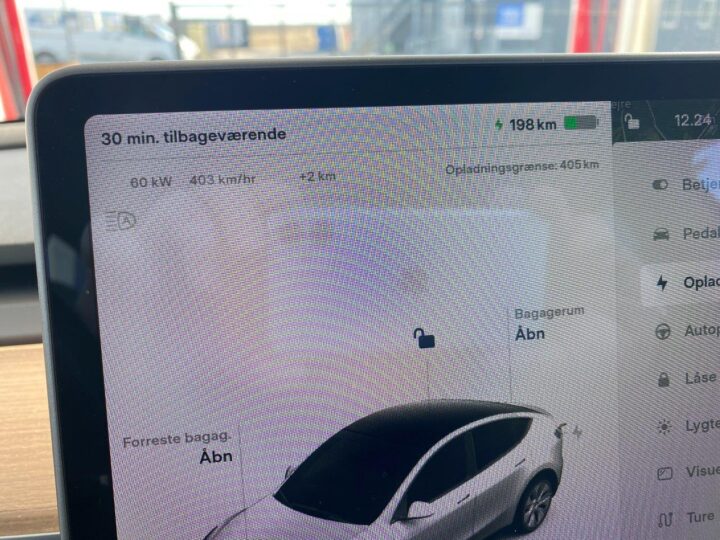 Efter to minutters opladning kan vi konstatere, at bilen lader med 60 kW. Meget langt fra det tempo bilen kan oplade, og meget langt fra det max der oplyses for denne Tesla ladestation. Men som sagt, det er ikke Teslas skyld.