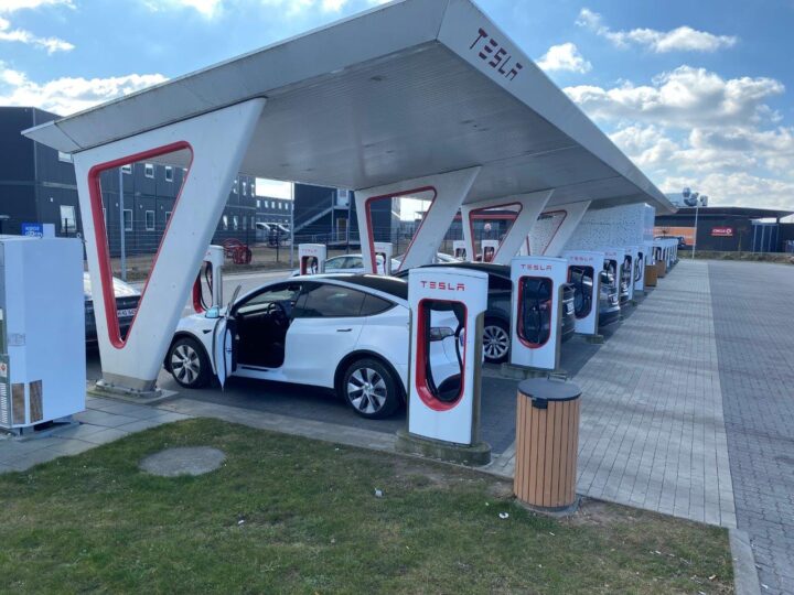 Den medbragte Tesla Y LR holder på fløjen på et godt pakket Tesla ladeanlæg.