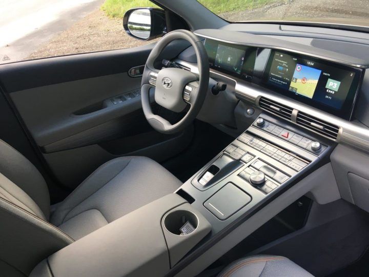 Kabinen i Nexo er et orgie i kontakter og drejeting, ligesom skærmen i midterkonsollen nærmer sig Tesla størrelse.