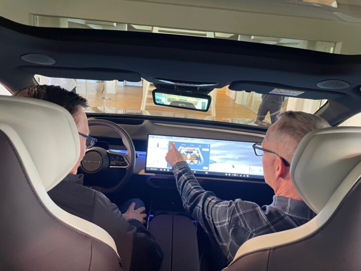 Det er mest skærm, – vi kan endda udvide til langt det meste er skærm, og når vi så oplyser priser på de to modeller, der er 330.000 kr og 352.000 kr, er det helt oplagt at spekulere på, om man skal investere i den store model, for de digitale sidespejle er udstyr, som mange tager afstand fra, og det er ikke muligt at købe en Tacumi Plus uden de digitale sidespejle.