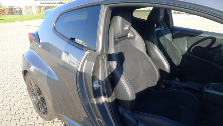 Et kort blik på Yaris GR eller GR Yaris afslører, at her har vi noget særligt. Bilen har et ganske anderledes udtryk, den er lavere, den er 3-dørs og det er ikke T. Hansen fælge, der sidder på bilen, det er noget ekstra lækkert, og med 1,5 centimeter lavere højde over dørene og 9,5 cm mindre ved hækspoileren, får denne Yaris et helt andet udtryk. Det her lover GTI for de få, faktisk er GR Yaris en af de meget få typer GTI, der er tilbage, så en stor tak til Toyota for at fastholde traditionen, og det er ikke bare en kendt model med en kraftigere motor, den er på alle måder anderledes.