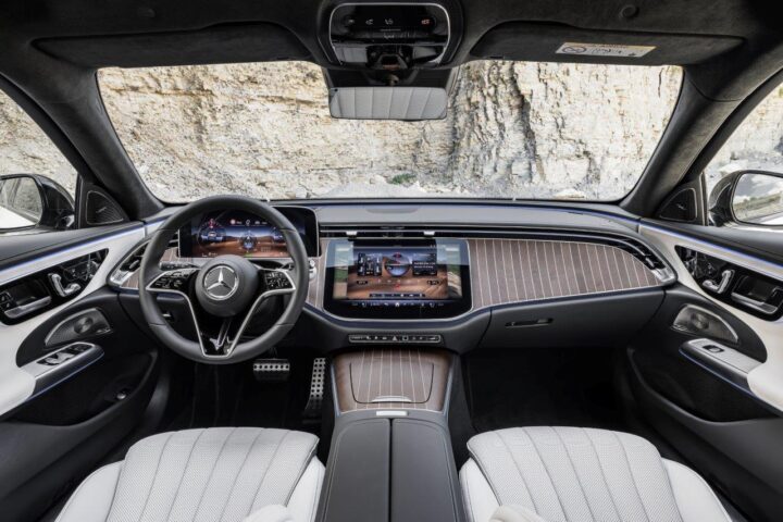 Selvfølgelig kommer E-klasse All Terrain med træk på alle fire, den kan også stikke af med en trailer på 2100 kg på fuldt lovlig vis, og motorprogrammet starter med en 197 hestes mild-hybrid diesel, sikkert en ganske lækker sag, men man kan også se sig småforkølet på en E-300 de 4Matic, når der er et lille ”e” i modelbetegnelsen, betyder det plug-in hybrid, og når vi taler om en bil med opladelige batterier, handler det også om rækkevidde som ren ellert, og her oplyser Mercedes, at vi ligger omkring 102 km. Topmodellen i denne afdeling af E-klassen hedder 450 4Matic med 6-cylindret maskineri, mild-hybrid med overboost funktion og max 381 HK.