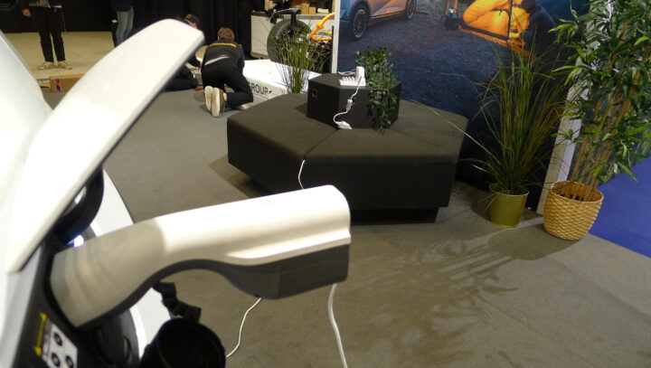 Hyundai taler om superhurtige ladetider i Bella Center, og tricket er måske en helt anden type ladekabler. Tjek den eksterne ladeenhed på møblet i baggrunden.