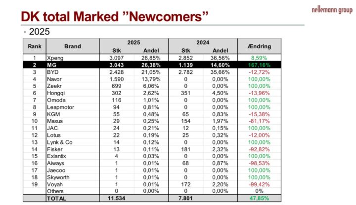 Til gengæld er nye bilmærker som Xpeng, MG og BYD kommet ind på listen, og det giver os anledning til et kik på det Nellemann Group har valgt at kalde de nye eller ”newcomers”, og rækkefølgen på denne liste over fortrinsvis kinesiske bilmærker, er netop som skrevet, med Xpeng som den mest solgte kineser, og det kommer helt ærligt som en overraskelse for denne redaktion.
