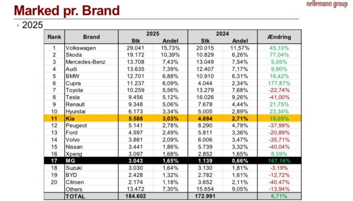 Med flere end 29.000 nye biler i 2025 og en fremgang på 45 procent, sidder VW godt og tungt på flæsket. Det bliver ikke lettere for konkurrenterne, når nærmeste forfølger er Skoda, der med flere end 19.000 nye biler og en fremgang på imponerende 77 procent, sætter sig tungt på pladsen som