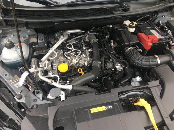 En anden fordel ved visse systemer mild-hybrid er en anden type startmotor. Den gammeldags type startmotor med tandhjul mod tandhjul på svinghjulet er afskaffet på flere typer mild-hybrid, men ikke hos Nissan. Når vi koldstarter om morgenen, kan man stadig høre relæet klikke, hive tandhjulet til indgreb på svinghjulet, og sætte gang i de fire cylindre, der starter hurtigt og helt uden problemer.