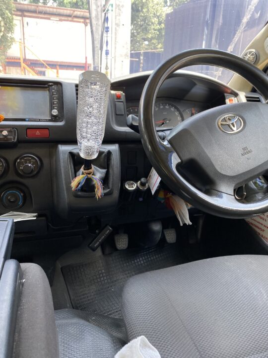Det var helt umuligt at stå for denne højst seværdige gearstang i Toyota-bussen. Nu kender vi ikke Thailands svar på T Hansen, men hvis vejen igen falder forbi, må det være et absolut must-see mål, for der er tale om en meget kunstfærdig udformet gearknop, og ikke en let forstærket vandflaske.
