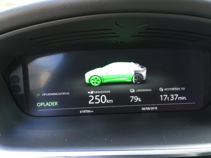 Således kørte vi 130 km/t, når det var grænsen og 110 km/t eller mindre hvis det var påbudt, og da vi landede ved ladestanderen, var der allerede foretaget et ganske pænt indhug i bilens ”tankbeholdning”.