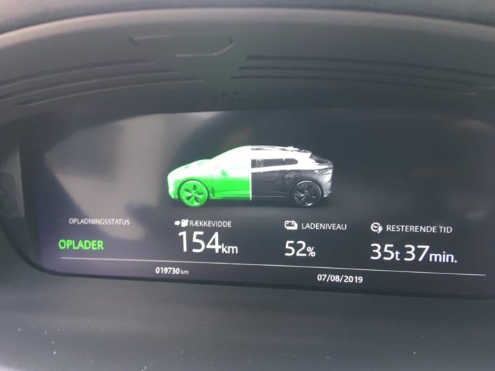 Den såkaldte lynlader fra e-on kunne heller ikke lokke I-Pace til at lade lidt hurtigere, og for at føje spot til skade, er bilens indre regnemaskine heller ikke helt i orden. Batteriets rækkevidde tæller baglæns mod nul. Da det havde mistet 100 km i rækkevidde, havde vi rent faktisk kørt 70 km på motorvej, men det havde vi også gjort før opladning, så bilens indre system kendte beregningen.