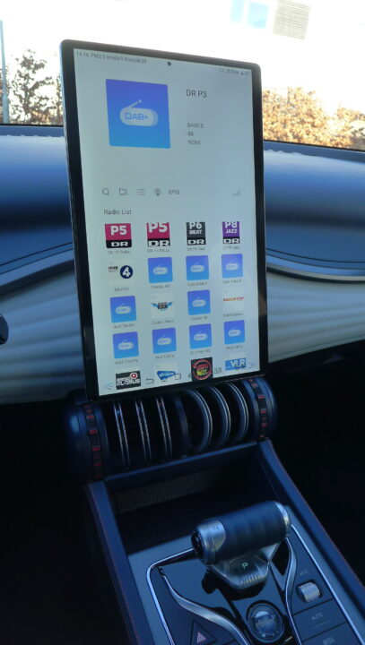 Drejelig storskærm i bilen BYD. Virker det? Ja da, både ved tryk på det dertil indrettede felt på skærmen, men den kan også drejes betjent fra rattet, og det er nok mindre heldigt. Det kan virke distraherende, hvis man kommer til at trykke ved en fejl, men familiens juniorer synes det er ualmindelig interessant, og forlanger nærmest, at skærmen skal vende og dreje i takt til strengelegen på dørene.