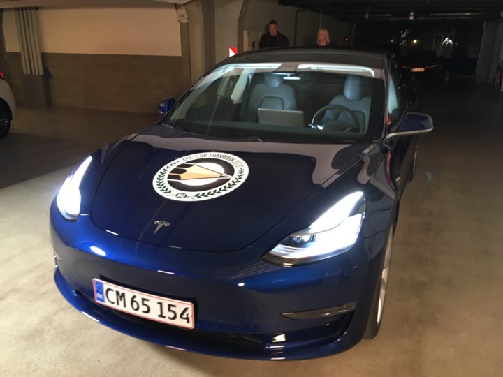 Tesla model 3 er den første el-bil der kører med titlen Årets Bil Danmark. Tesla hentede en nogenlunde komfortabel sejr foran Peugeot 208, der endte som årets nummer to., Til højre for bilen er det Karsten Lemcke, formand for Danske Motorjournalister, Maris Lantz fra Tesla Sverige og den danske Tesla chef Kim Jensen.