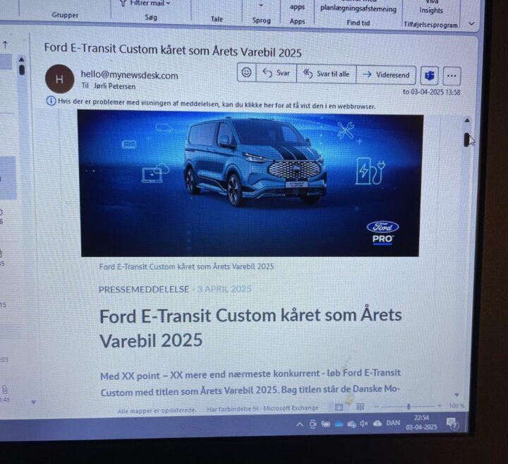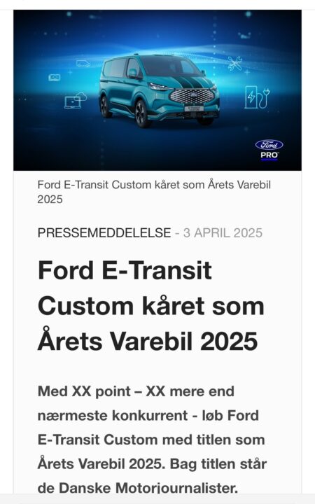 Knap var resultatet at årets kåring kendt, før der var nyt fra Ford. Vi klikkede på nyheden, og kunne læse, at Ford Custom Transit var kåret som Årets Varebil i Danmark 2025.